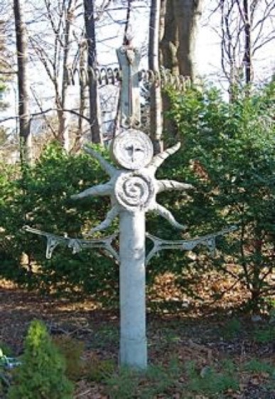 Always drawn to mixed materials, here I’ve created a combination of cement and iron. The top part was created when I acquired two rocker arms with springs attached from an old automobile. The two separate pieces welded together suggested a strange looking bird. Using a metal clamp, I welded it in place to create a beak. The iron projections under the “sun” shape, at one time was the structure that supported a very old school desk with a folding seat.
