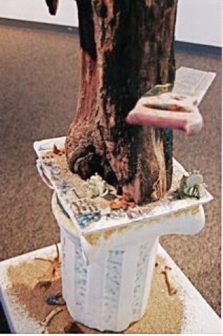 The Grecian-style, plaster pedestal has collage imagery affixed to the top surface, partially hidden by sand and saw dust, cactus, and the section of log. At the base of the pedestal is sand and dried bones - simultaneously suggesting life, death and history. The saw represents the variety of things in society producing change - building up and/or taking down. On the whole, we humans aren’t all that comfortable with change.