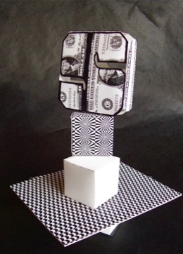 Stephanie chose the photo-copied dollar bill as pattern-imagery for the main focal area of this composition. Size and contrast (to the other design elements ) tends to control what she wants you to see first. Folding a Bristol paper rectancle she opened up the interior of the form by cutting appropriate shapes in the surface.