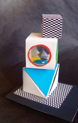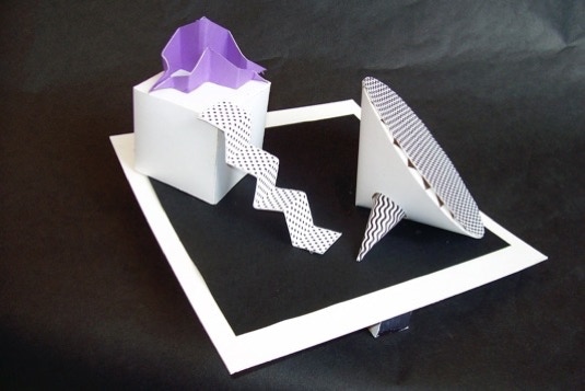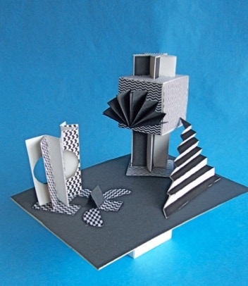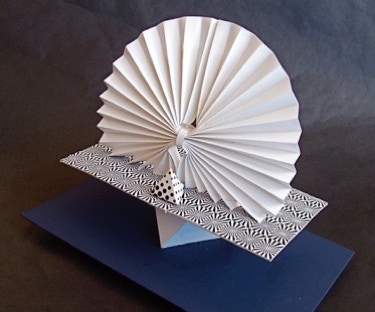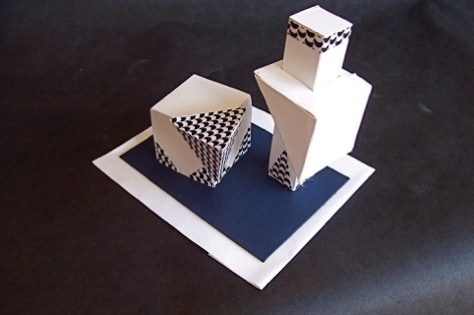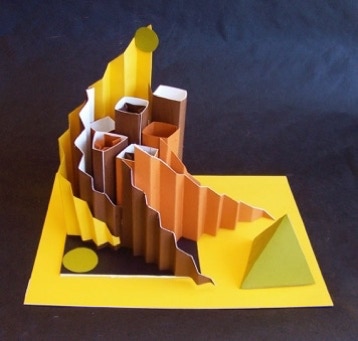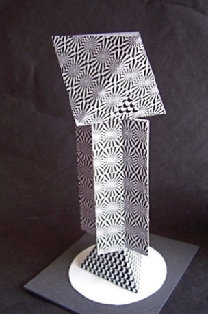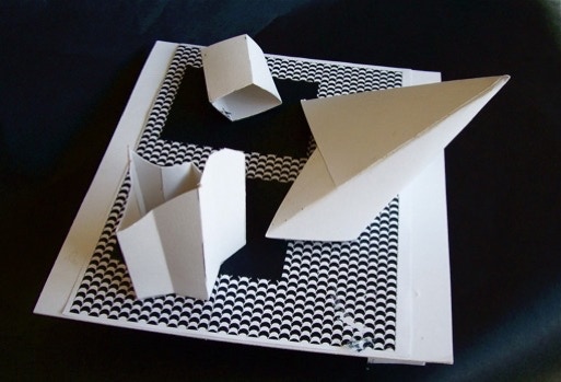 was to use some of the same geometric forms used in the previous assignments, but incorporate the accordian-fold as a new, significant design element. The space that the sculptures are to be seen is defined by the placement of the major forms in the boundries of an elevated pedestal.