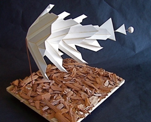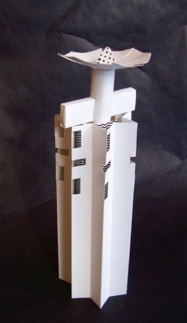 I’m sure this project was influenced by a previous exercise requiring students to create a form that used texture as a surface. In this case, there was a bucket of chips left by one of the other instructors, so Elliot saw possibilities here and helped himself. The complicated sequence of accordion folded shapes, one within the other, is an expressive statement about motion and transformation.