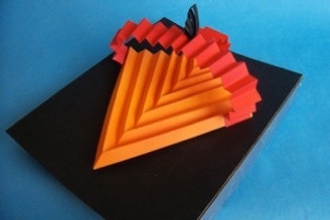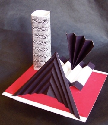 Kiesha’s stunning combination of just three colors is a marvelous example of “less is more” approach to design. Reinforcing this concept is her understanding of the importance of establishing a “theme,” epressed in her using the accordion fold in a variety of ways; she establishes the main focus through the larger triangular wedge that appears ready to take flight in its diagonal positioning. Regarding taking flight: