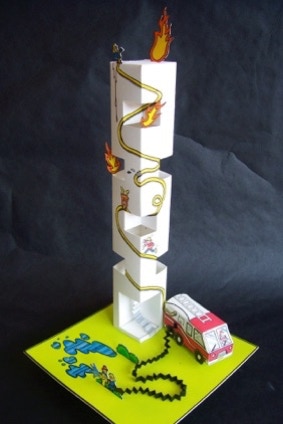 Cesar’s ready smile is expressed in the novelty of his “burning tower.” He exercises so many elements of design in this charming piece, where the accordian styled fire hose is trasformed into line as it snakes up the tower. All of it folded from Bristol paper, and punctuated with colored marker.