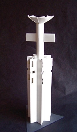 Because of tight storage space, Arien placed two separate exercises on the storage shelf, slipping the “cross” image inside the taller tower-like form on the left. In our conference I suggested he consider leaving the happenstance combination as a possibile design. His final dicision is on the right. Perhaps it is the final dicission, or perhaps not. Sometimes an artist has to live with a piece for awhile.