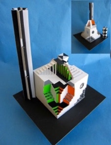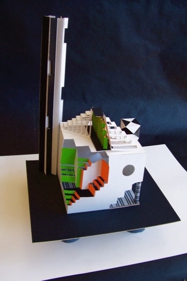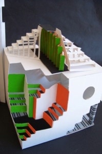This is Nadia’s second construction, far busier than the one above, Where she opens up the interior space, as well as penetrating all with two colorful triangular beams.