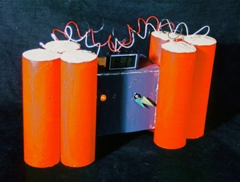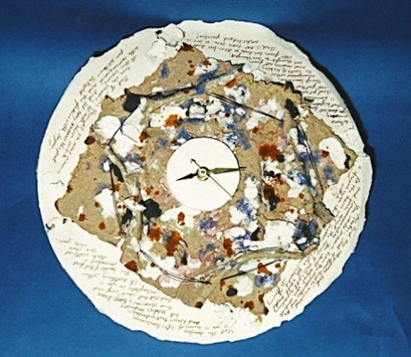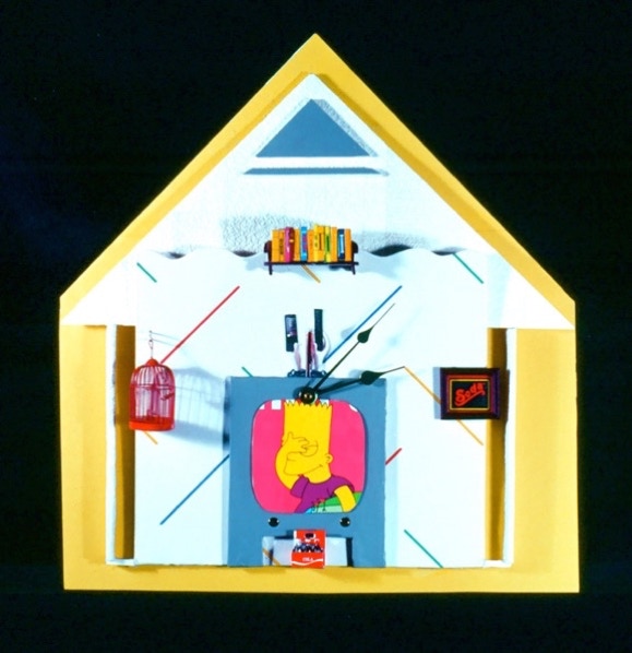 This one uses color as it’s main design element. And look at the exploration of spacial depth - actual birdcage, bookshelf and several layers of foamcore. Plus, those items are used as substitutes for numbers. Student uses colored shapes and their central position to lead your eye to the main center of focus. One design “flaw” is that the cental colorful design is sooooo strong that it is difficult to see the hands of the clock to tell the time.