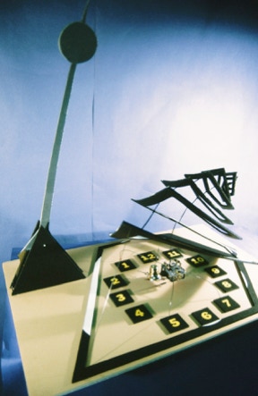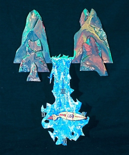 Bristol paper kayak on “second hand” keeps moving into new positions. Note depth created by layers of foamcore in mountains. Too bad they used Roman numerals for numbers - the style is out of character for the design.