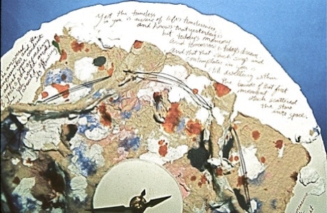 Approximately 12”H, Foamcore, acrylics, and wood beads for pedestal legs.