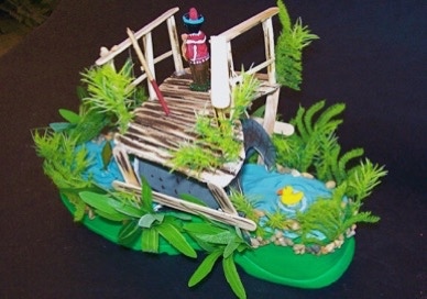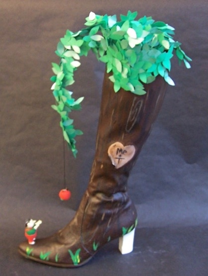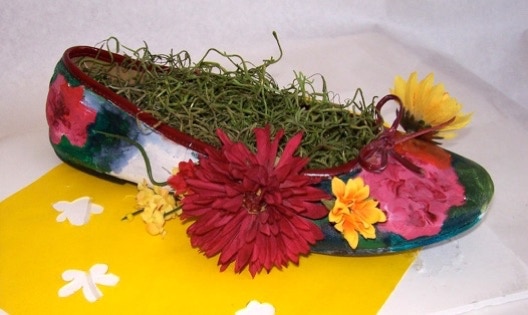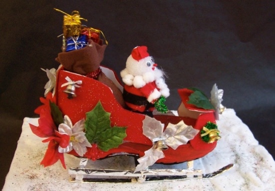 Nadia Harding uses a summer sandal to create a tropical island out of the right sandal. In a change of pace, she creates Santa’s sleigh out of the left shoe.