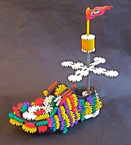transforms a man’s shoe by gluing plastic toy parts to the surface. then Installs a motor-driven propellor that plays music as it turns.