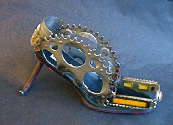 Anthony DiCarlo’s welding skill assists him in creating a woman’s high heel using bicycle parts. Woman’s “pump”?