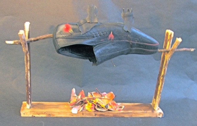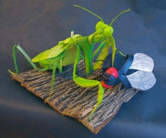Cesar Cristancho transforms a woman’s high heel shoe into a Praying Mantis feasting on a fly; made from a flip-flop sandal.