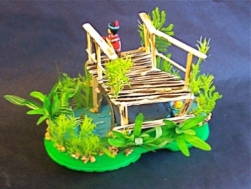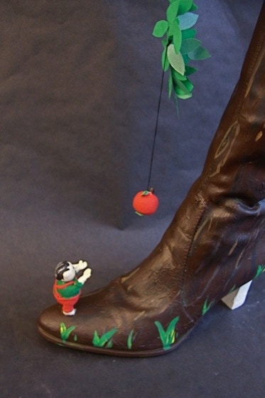 At first glance, from the top, the shoe doesn’t seem to have a whole lot going on except a predominance of “grass”. It is when you see it from this angle that things are happening. Notice the “repetition with variation” going on for unifying the compostiion: the three dimensional flowers repeated in the two-dimensional painted version,. She then stretches the exercise further through creating cut-outs of flower images in the yellow paper. Tyler is thinking like an artist.