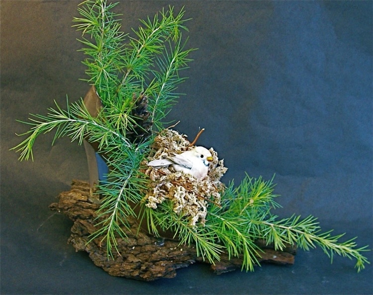 Alexia Castelli creates a “shoe-nest” from a woman’s high heel afixed upon a slab of tree bark.